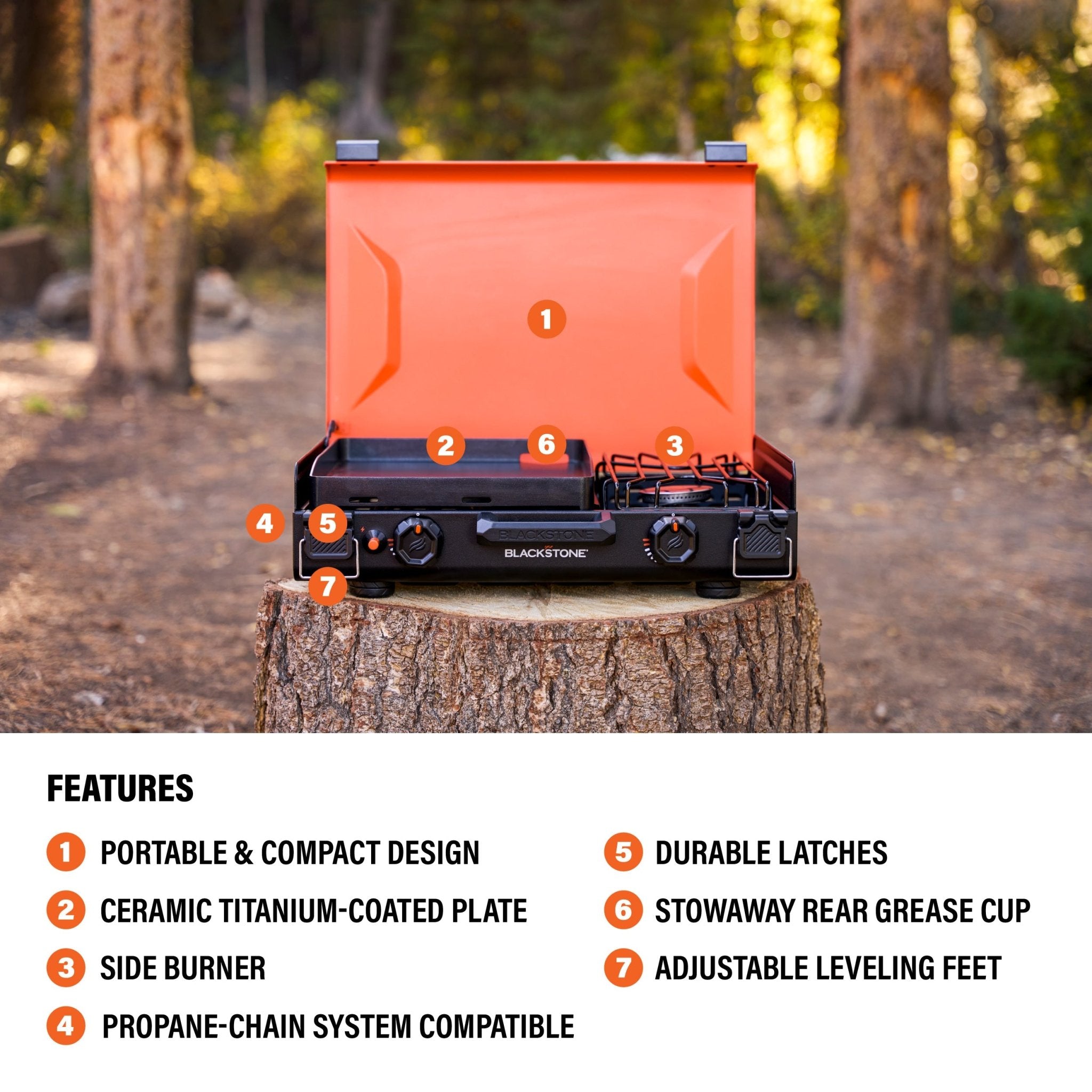 Make great meals on the go with the Blackstone OTG 14” Griddle with Side Burner. The portable design with a latching hood and handle makes carrying this griddle as easy as carrying a briefcase. With the side burner, you can heat up water for coffee or hot chocolate or gravy and other sauces, while cooking your main dishes. Convenient add-ons like leveling feet to help keep your cooking surface more even makes it easy to bring the taste of home cooking with you wherever you go next. Cook Anything, Anytime, Anywhere® with the OTG 14” Griddle with Side Burner.