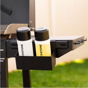 - Dual fixed side shelves with side shelf hooks add prep space and easy access to cooking tools.