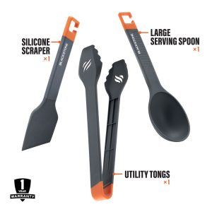 Pack the Blackstone 3 Piece Camping Tool Set on your next adventure, so you’ll have the essential tools for cooking breakfast, lunch, and dinner on the go. The set includes a large serving spoon, a silicone scraper, and utility tongs, perfect for cooking and keeping your griddle clean. Be prepared for every adventure with the 3 Piece Camping Tool Set!