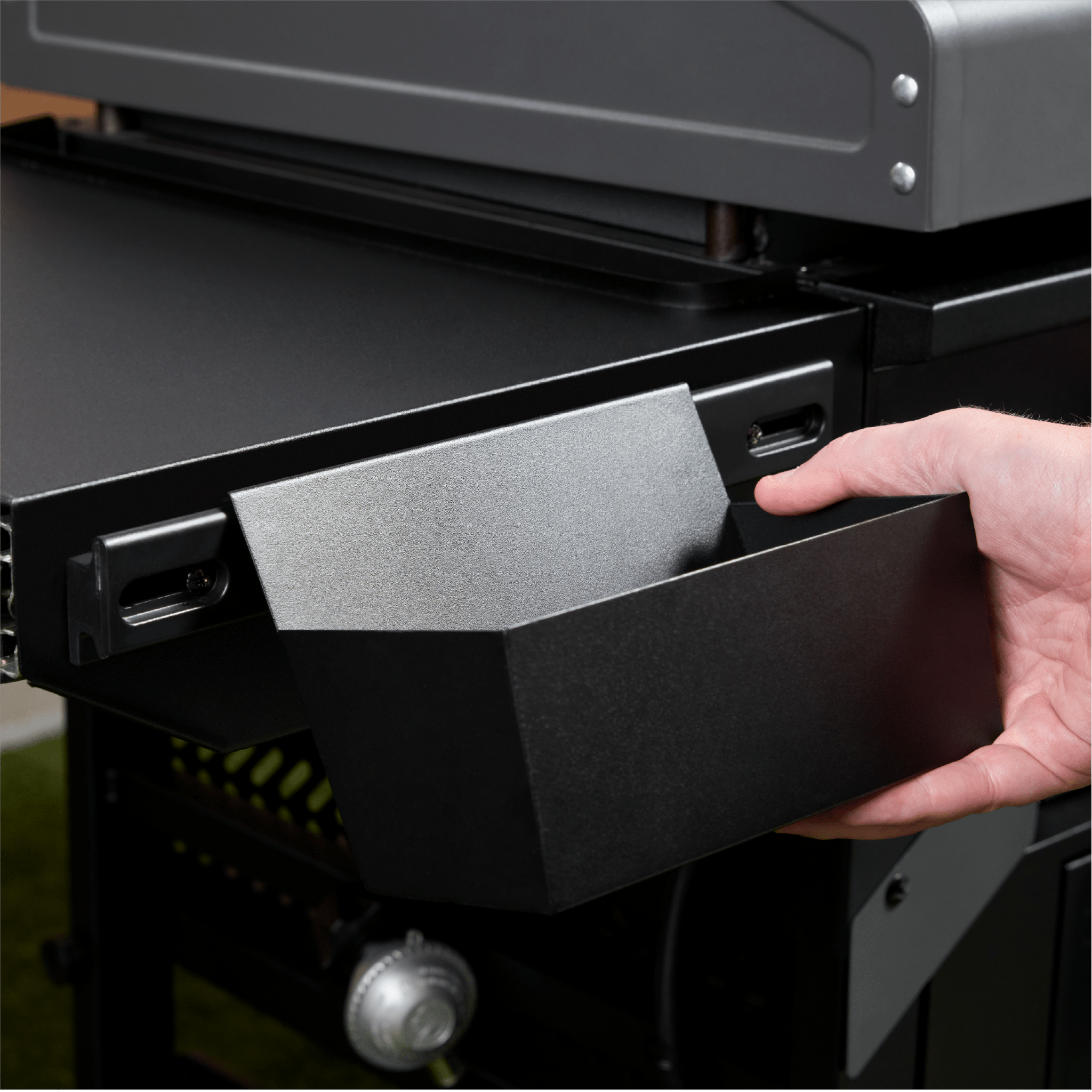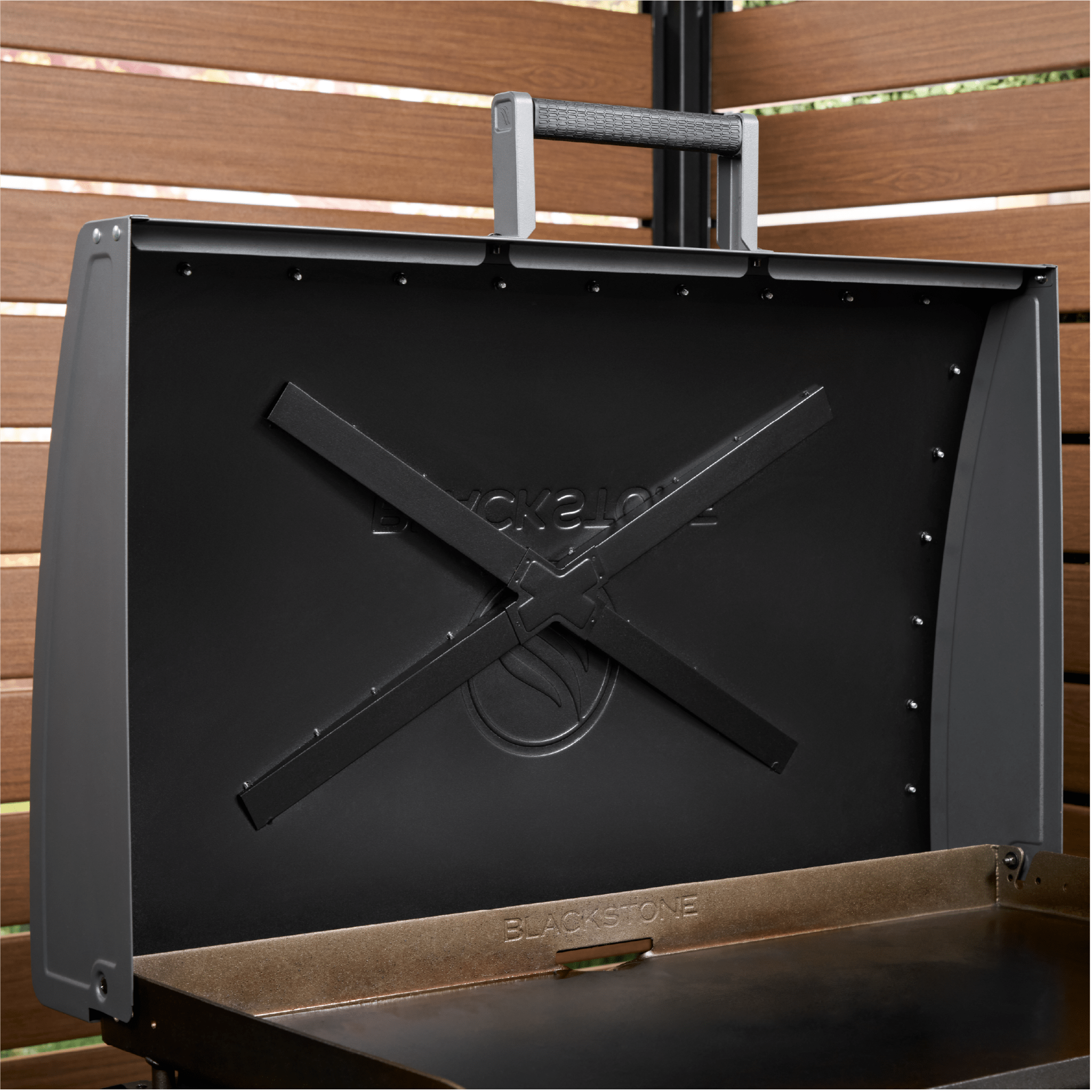 - Reinforced ‘X’ brace hood protects your griddle surface between uses.