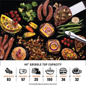 The Blackstone 44” Omnivore Griddle with Hard Cover is perfect for serving mountains of food. Equipped with the Omnivore Griddle Plate for better heat distribution and fuel efficiency and five independently controlled heat zones, you’ll be cooking breakfast, lunch, and dinner for the entire neighborhood. With side shelves for extra prep space without sacrificing storage space and locking caster wheels to keep your griddle in place, you’ll have everything you need for any meal. Complete your backyard kitchen with the 44″ Omnivore Griddle with Hard Cover!