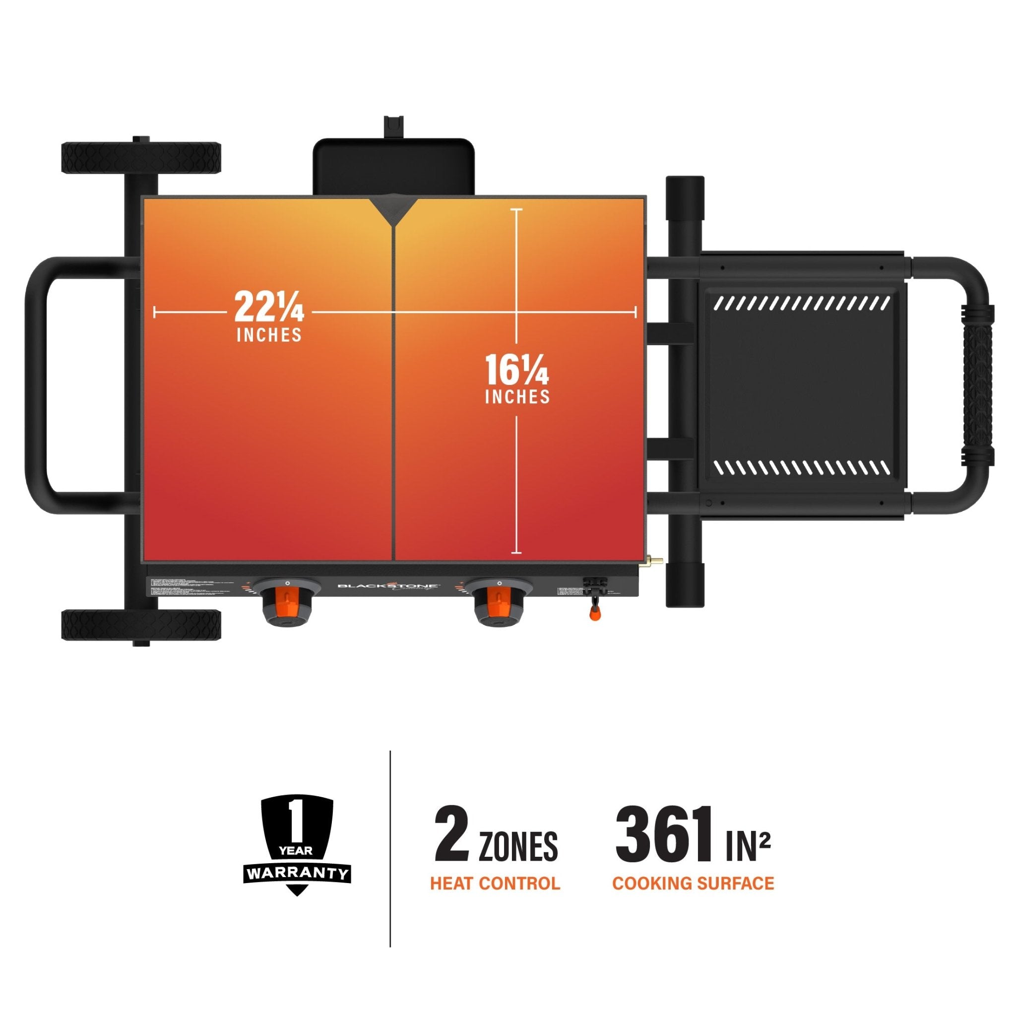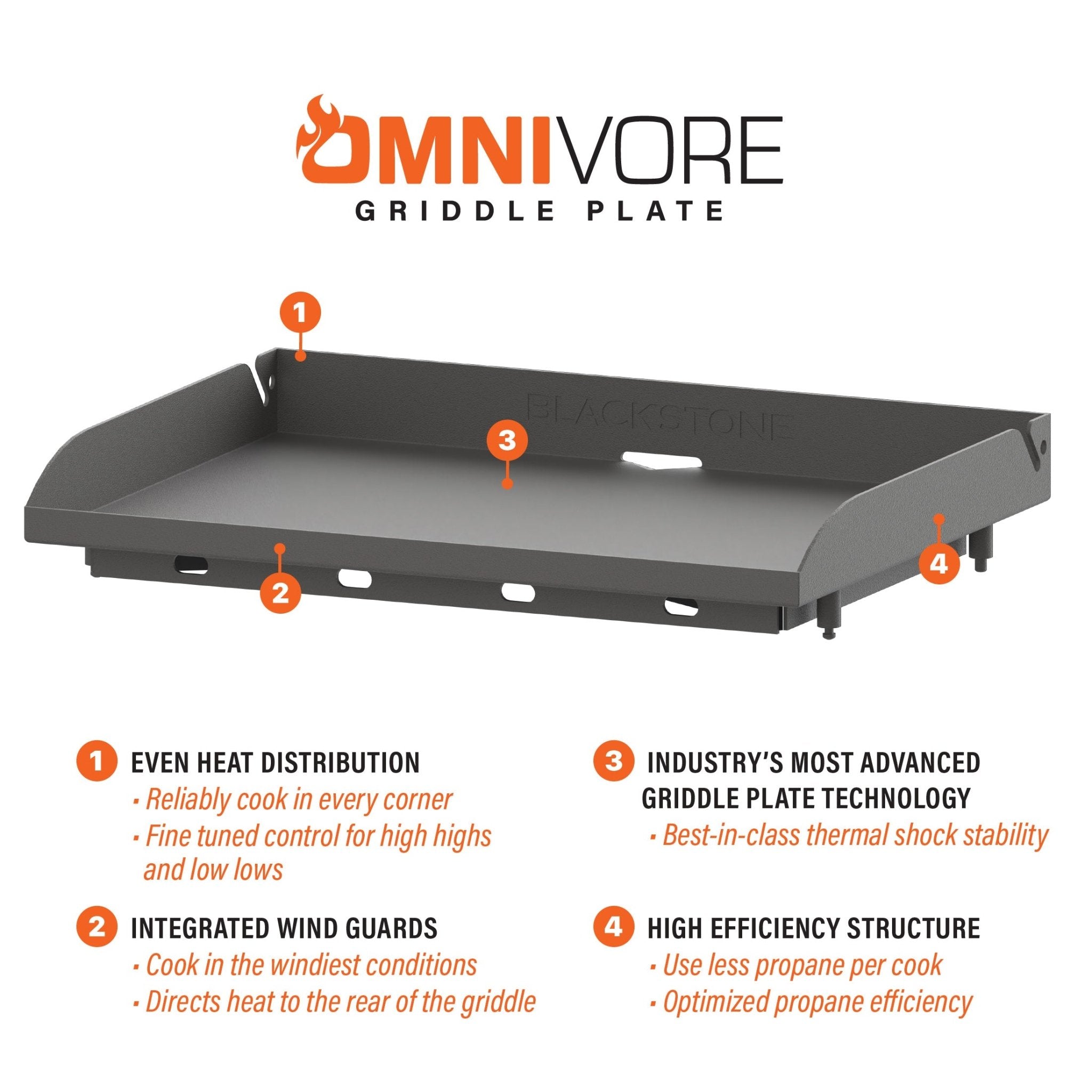- 22” Omnivore Griddle Plate with even heat distribution, higher fuel efficiency, and built-in wind guards.