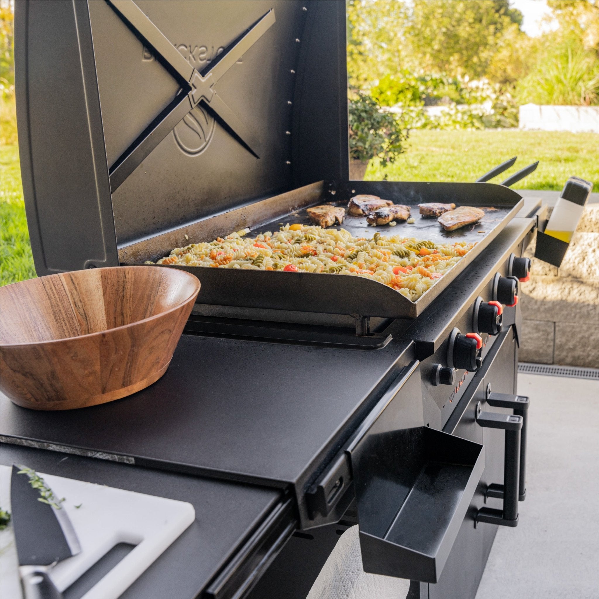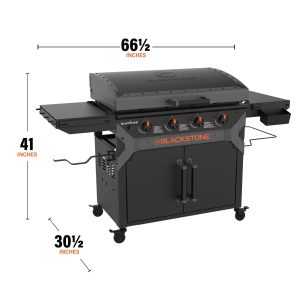 - Reinforced ‘X’ brace hood protects your griddle surface between uses.