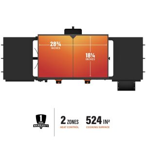 - 28” Omnivore Griddle Plate: Quicker preheat and recovery times, even heat distribution, higher fuel efficiency, and built-in wind guards for heat retention and cool shelves.