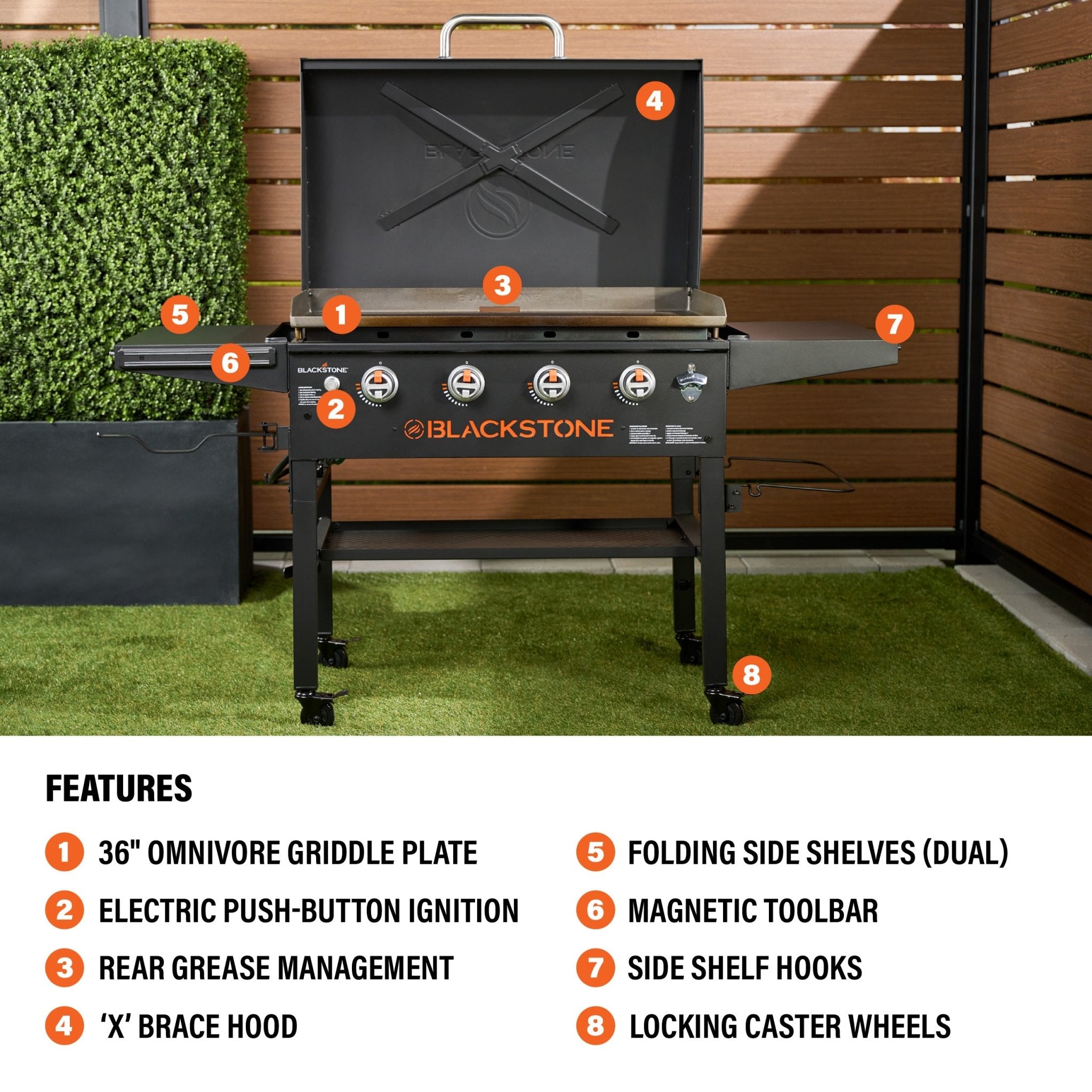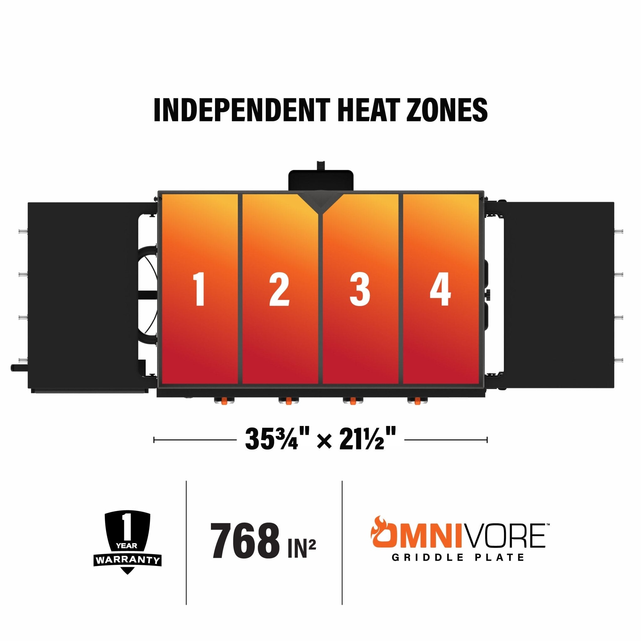 - 36″ Omnivore Griddle Plate: Quicker preheat and recovery times, even heat distribution, and higher fuel efficiency, with built-in wind guards to keep the hot air in and the cool air out.