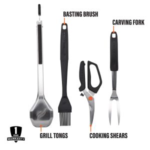 - Kit includes silicone basting brush (Qty. 1), cooking shears (Qty. 1), carving fork (Qty. 1), and grill tongs (Qty. 1).